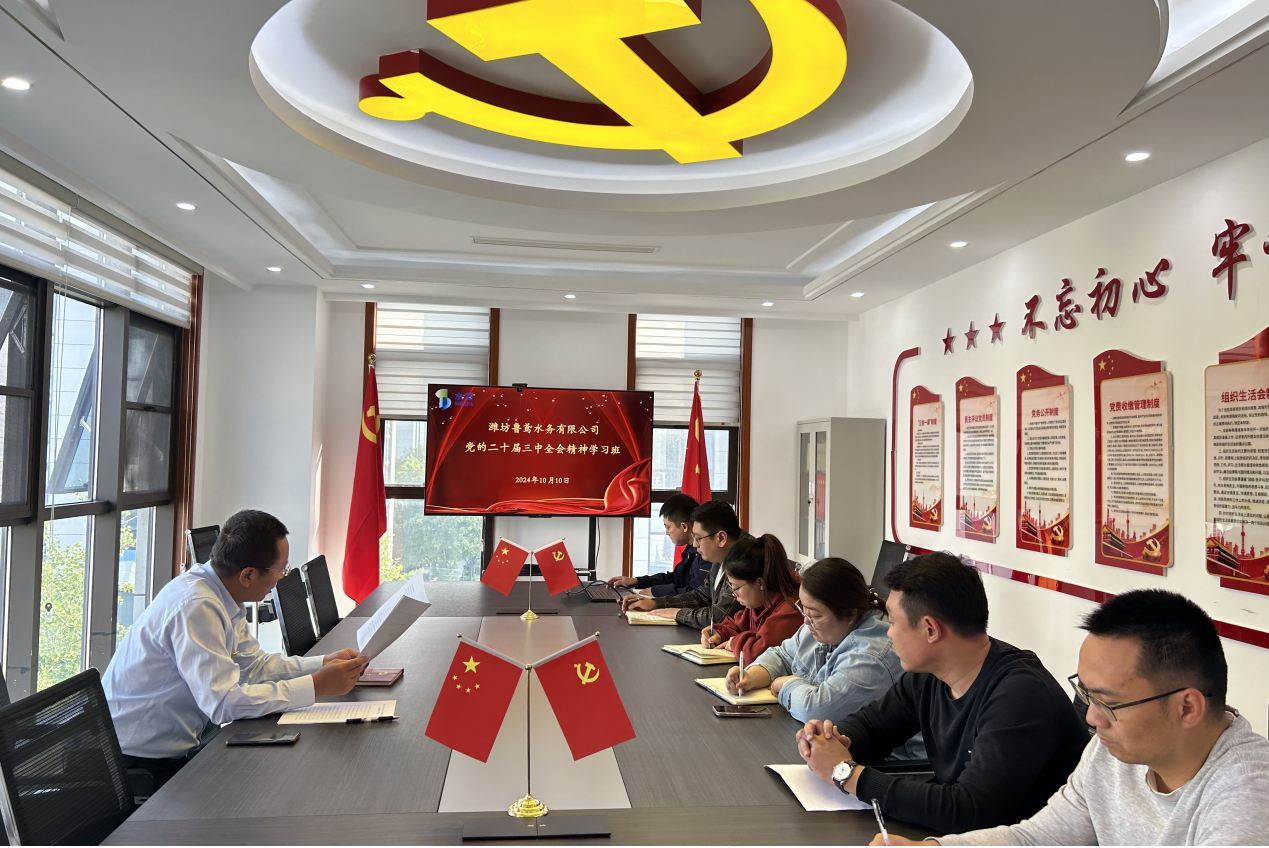 濰坊魯鳶水務有限公司黨支部組織多種形式學習傳達黨的二十屆三中全會精神,迅速掀起學習貫徹全會精神熱潮。通過集中領學、個人自學、交流研討等形式,全面認真學習了習近平總書記重要講話、中央《決定》及全會《公報》,并圍繞企業(yè)改革、企業(yè)高質量發(fā)展等主題開展深入研討交流。