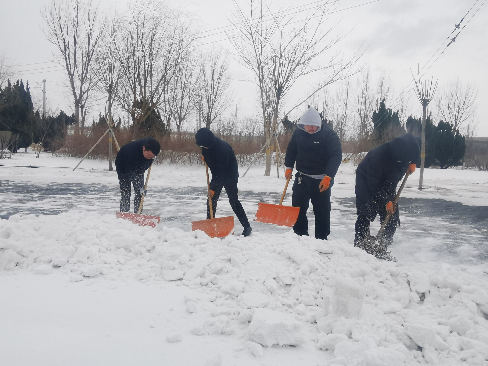 工作人員奮戰(zhàn)在除雪一線,頂風冒雪、不懼嚴寒,手持掃帚、鐵鍬等除雪工具,認真細致地清掃道路積雪,確保出行安全。